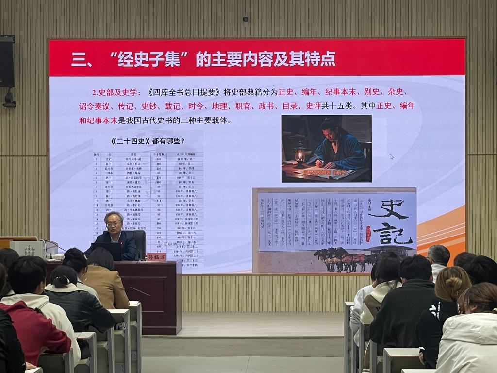 报告会以《中国传统知识体系再认识——从“经史子集”谈起》为题,通过“四部之学”形成过程、“经史子集”主要内容、“七科之学”的演变的阐述,探讨“经史子集”对弘扬传统文化的启示。报告以翔实的内容、生动的语言、丰富的例证,带领师生重温中国传统知识体系,探讨中国传统知识体系的演变过程及对中国知识体系和文化传承的影响,深入思考如何在新时代传承发展中国传统知识体系,受到了师生的一致好评。